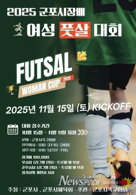뉴스펀치 김길룡 기자 | 군포시는 여성 생활체육 참여 확대와 건전한 스포츠 문화 확산을 위해 ‘2025 군포시장배 여성 풋살대회’를 오는 11월 15일(토) 군포시 국민체육센터 축구장에서 개최한다.