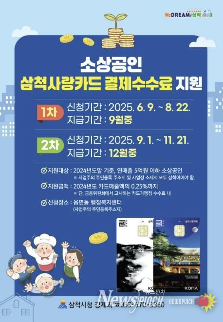 뉴스펀치 김길룡 기자 | 삼척시는 소상공인의 경영 부담을 덜고 지역경제 활성화를 위해 추진 중인 '2025년 삼척사랑카드 가맹점 결제수수료 지원사업'의 2차 신청이 오는 11월 21일 마감된다고 밝혔다.
