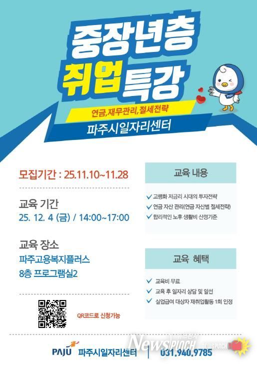 뉴스펀치 김길룡 기자 | 파주시는 오는 11월 10일부터 28일까지 ‘중장년층 취업 특강’에 참여할 교육생 15명을 선착순으로 모집한다.