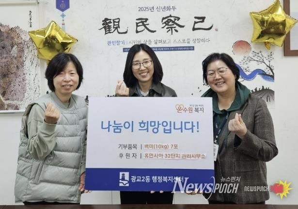임지희 관리사무소장은 “단지 내 어려운 이웃들을 생각하며 작게나마 힘이 되고 싶었다”며 “이 백미가 추운 겨울을 앞두고 따뜻한 식탁 위에 놓여 작은 희망이 되길 바란다”고 말했다.