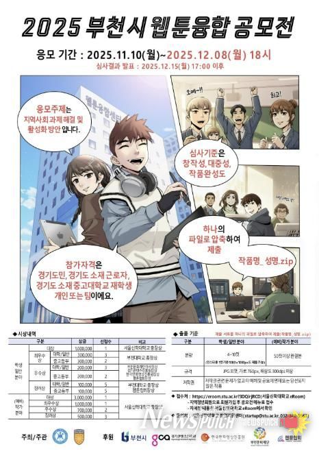 뉴스펀치 김길룡 기자 | 부천시는 11월 10일부터 12월 8일까지 서울신학대학교 ‘이룸(eRoom)’ 플랫폼을 통해 지역 웹툰 창작 생태계를 조성하고 차세대 창의인재를 발굴하기 위한 ‘2025 부천시 웹툰융합공모전’을 개최한다.
