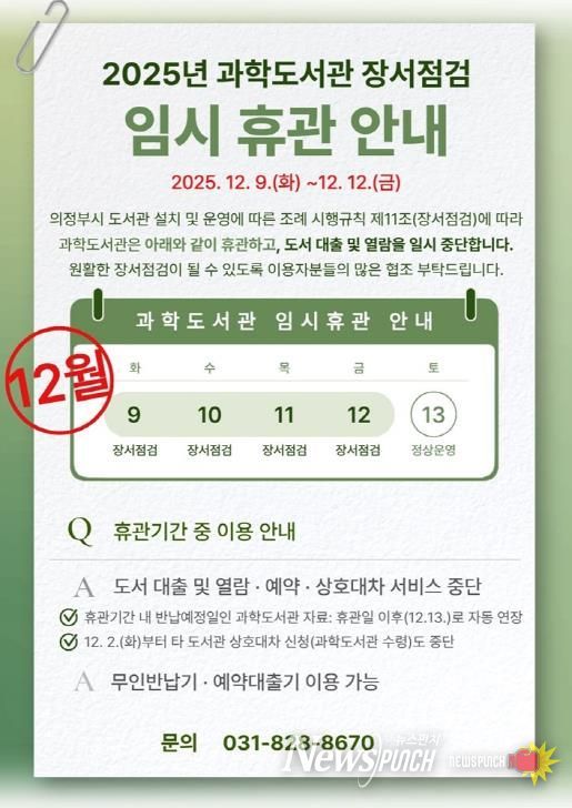 뉴스펀치 김길룡 기자 | 의정부과학도서관은 소장 자료의 상태와 보유 현황을 체계적으로 점검하기 위해 12월 9일부터 12일까지 4일간 임시 휴관한다.