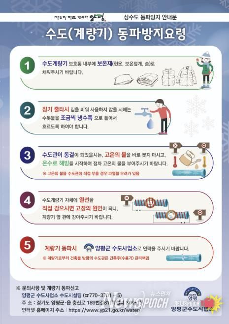 뉴스펀치 김길룡 기자 | 양평군은 본격적인 한파에 대비해 군민들의 수돗물 사용 불편을 최소화하고 안정적인 급수 공급을 위해 ‘동절기 수도시설 동파방지 종합대책’을 수립·추진하고 있다.