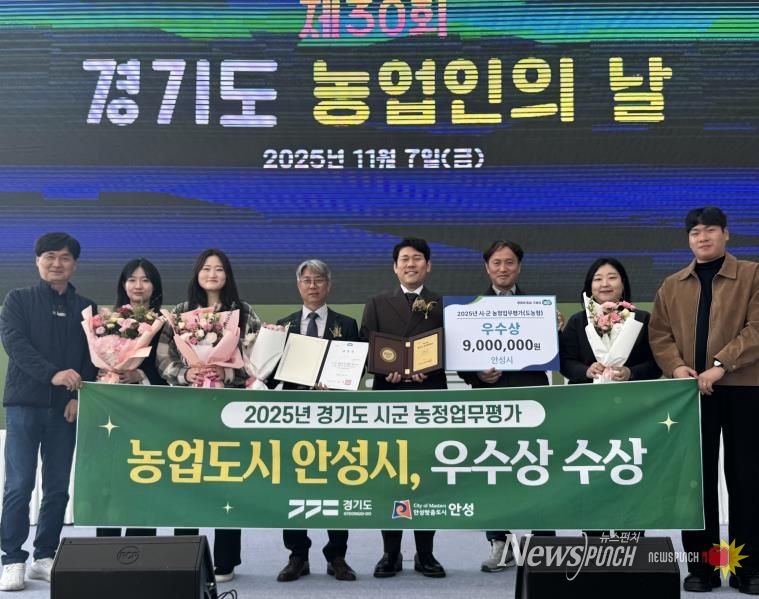 뉴스펀치 김길룡 기자 | 안성시가 2025년 경기도 시·군 농정업무 평가에서 우수 기관으로 선정되어 ‘우수상’을 수상했다. 지난해 ‘장려상’을 받은데 이어 올해는 한 단계 도약한 성과를 거두며, 지역 농정 추진 역량을 다시 한번 입증했다.