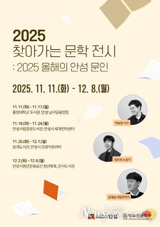 이번 '찾아가는 문학 전시'는 안성 문학 진흥사업 선정 ‘2025 올해의 안성 문인’을 홍보하기 위해 진행되는 관내 기관 순회전시이다. 전시 현장에는 이동식 전시 패널과 문학 퀴즈 부스가 설치되며, 시민 누구나 자유롭게 관람할 수 있다. 예정된 전시 일정 및 장소는 ▲중앙대학교 도서관・안성 남사당공연장(11.11.~11.17.) ▲안성시립중앙도서관・안성시 세계언어센터(11.18.~11.24.) ▲보개도서관・안성시관광지원센터(11.25.~12.01.) ▲안성시청년문화공간 청년톡톡・진사도서관(12.02.~12.08.) 순이다.