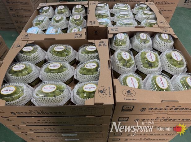 뉴스펀치 김길룡 기자 | 영주시는 지난 10일 순흥면 회헌로 1040-13 소재 영주포도수출영농조합법인(대표 배석준)에서 영주 샤인머스캣의 대만 수출을 기념하는 선적식을 개최했다.