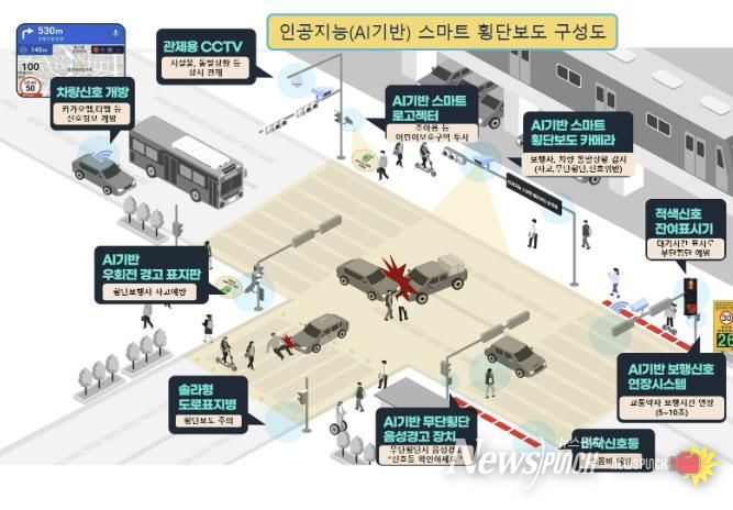 AI 기반 스마트 횡단보도는 보행자의 움직임과 차량 접근을 실시간으로 감지하는 센서와 카메라를 통해 교통량·보행량 정보를 실시간으로 수집·분석한다.