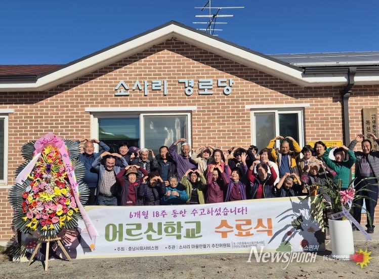 뉴스펀치 김길룡 기자 | 충남사회서비스원은 11월 10일 소사리마을회관에서 농‧어촌 돌봄시스템 구축사업의 일환으로 진행된 천안 목천읍 소사리 어르신학교 수료식을 진행했다.