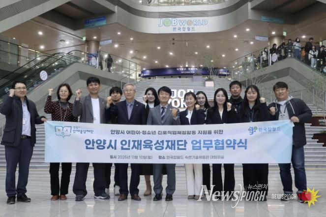 뉴스펀치 김길룡 기자 | 안양시 인재육성재단은 10일 한국잡월드 숙련기술체험관 대회의실에서 직업진로체험 대표기관인 한국잡월드와 업무협약을 체결했다고 11일 밝혔다. 이번 협약은 안양시 어린이·청소년의 다양한 진로·직업체험 및 교육지원을 위해 양 기관이 상호협력을 강화하고자 추진됐다.