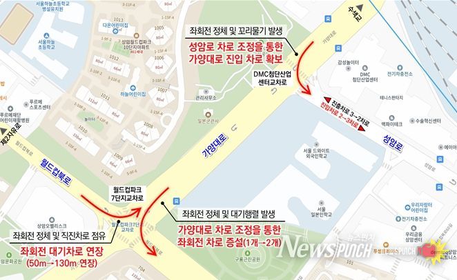 뉴스펀치 김완규 기자 | 교차로 꼬리물기와 정체가 반복됐던 가양대로(월드컵파크7단지 교차로 ~DMC첨단산업센터 교차로)에 좌회전 차로가 추가되고, 교통량이 많아 좌회전 대기차량이 직진차로까지 점유했던 올림픽선수기자촌아파트 교차로·중앙대병원입구 교차로는 대기차로 연장을 늘린다. 또 중계역 교차로·서빙고동주민센터 교차로 등 도로 기하구조도 개선된다.