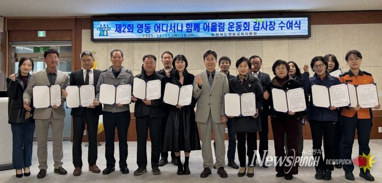 뉴스펀치 김길룡 기자 | 충청북도영동교육지원청은 11일 교육지원청 2층 대회의실에서 ‘제2회 영동 '어디서나 함께' 어울림 운동회’의 성공적 개최에 기여한 지역사회 유공 민간인 및 단체에 감사의 마음을 전하는 자리를 가졌다.