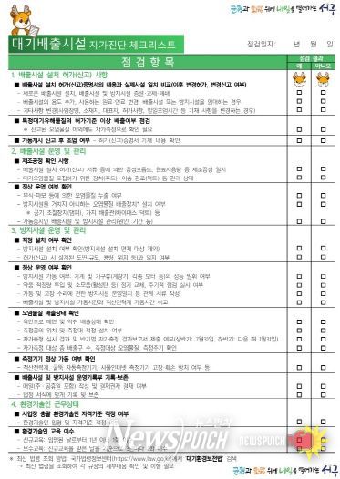 뉴스펀치 김길룡 기자 | 인천 서구는 관내 환경오염물질 배출사업장의 자율적인 환경관리 역량을 강화하고, 환경오염 사고를 예방하기 위해 '자가진단 체크리스트'를 배부한다고 밝혔다.