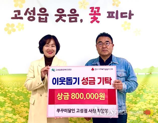 뉴스펀치 김길룡 기자 | 고성군 고성읍는 쭈꾸미달인 고성점 최창림 사장이 11월 11일, 관내 어려운 이웃들에게 전달해달라며 ‘전국노래자랑 고성편’에서 인기상 수상 상금 80만 원을 저소득층을 위해 기탁했다.