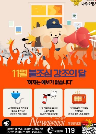 뉴스펀치 김윤걸 기자 | 나주소방서(서장 신향식)는 겨울철을 앞두고 화재 발생 위험이 높아지는 시기에 맞춰 ‘11월 불조심 강조의 달’을 운영하여 시민 모두가 함께 실천하는 안전한 난방·전기 화재 예방을 당부했다.