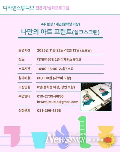 청소년 및 성인 대상의 〈나만의 아트 프린트(실크스크린)〉는 총 4회차로 진행되며, 실크스크린과 모노타입 기법을 활용해 자신만의 아트 프린트를 완성하는 창작 워크숍이다. 참여자는 직접 준비한 도안을 바탕으로 제판, 감광, 잉크, 인쇄 등 판화의 전 과정을 배우고, 이를 통해 자신만의 굿즈와 작품을 제작하게 된다. 상상캠퍼스 관계자는 “실크스크린은 단순한 인쇄를 넘어 개인의 감각을 시각적으로 표현하는 예술”이며 “이번 프로그램을 통해 시민들이 인쇄 예술의 즐거움을 체험하고, 자신만의 디자인 세계를 확장하길 바란다”고 말했다.