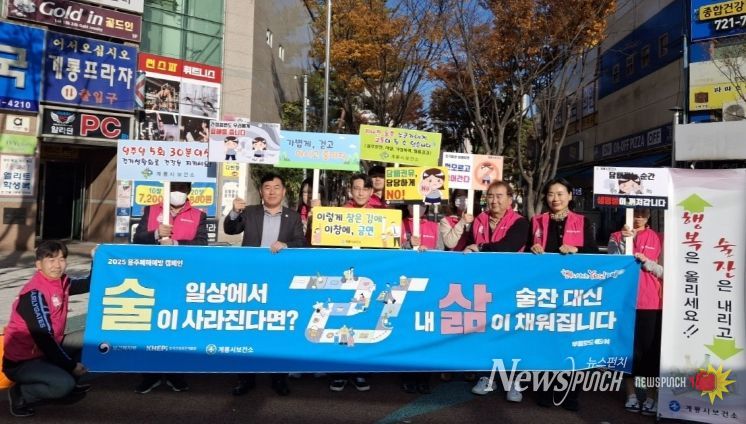 뉴스펀치 김길룡 기자 | 계룡시는 11일 엄사면 화요장터 일원에서 ‘음주폐해예방의 달’을 맞아 계룡시민 대상으로 절주·금연 캠페인을 진행했다고 밝혔다.