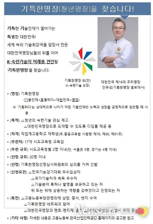 뉴스펀치 조평훈 기자 | 고용노동부는 청소년·청년 기술인재를 조기에 발굴해 숙련기술 인재로 성장을 지원하기 위해 '기술인재특별한대한민국명장' 제도를 새로 도입해 시행한다고 밝혔다.