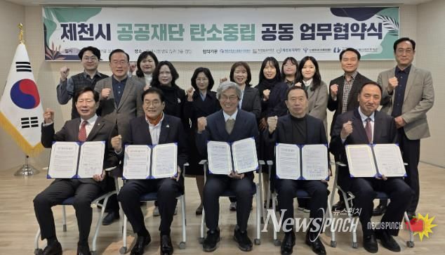 뉴스펀치 김길룡 기자 | 제천시탄소중립지원센터는 11월 11일 제천시평생학습관에서 제천시인재육성재단, 제천한방천연물산업진흥재단, 제천문화재단, 제천복지재단 등 4개 공공재단과 ‘제천시 탄소중립 거버넌스 협력 기반 조성을 위한 업무제휴 협약’을 체결했다.