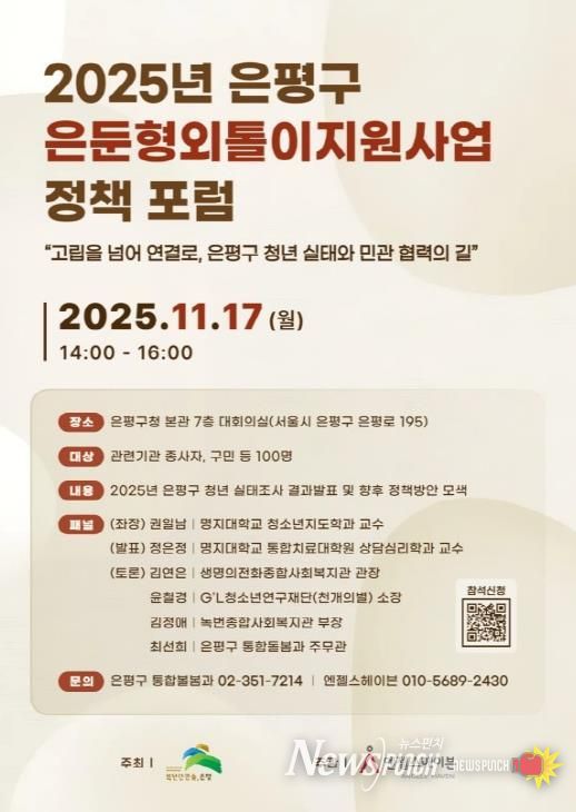 뉴스펀치 김완규 기자 | 서울 은평구는 외로움과 고립 위험에 취약한 청년층을 대상으로 민관이 협력할 방안을 모색하고자 오는 17일 ‘고립·은둔 정책포럼’을 추진한다고 밝혔다.