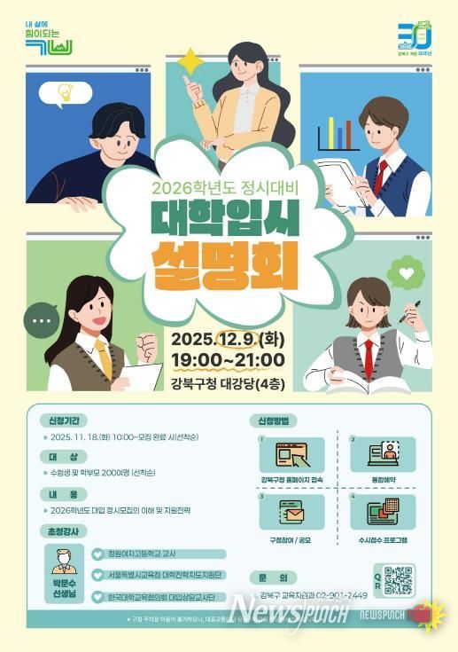 뉴스펀치 김완규 기자 | 서울 강북구는 오는 12월 9일과 13일 강북구청 대강당에서 ‘2026학년도 정시 대비 대학입시 설명회’와 ‘1:1 진로진학 상담’을 연이어 개최한다고 밝혔다.
