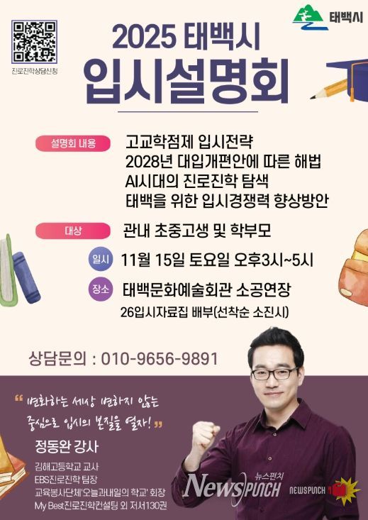뉴스펀치 김길룡 기자 | 태백시는 오는 11월 15일 오후 3시부터 5시까지, '2025 태백시 입시설명회'를 개최한다고 밝혔다.