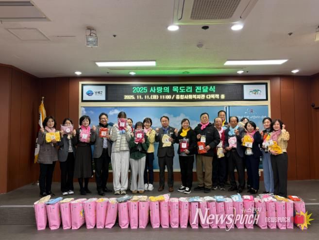 뉴스펀치 김길룡 기자 | 남해군은 지난 11일 종합사회복지관 지하 다목적홀에서 뜨개 나눔 봉사활동을 통해 완성된 목도리 260개를 지역 어르신들에게 전달하는 2025년 사랑의 목도리 전달식을 개최했다.