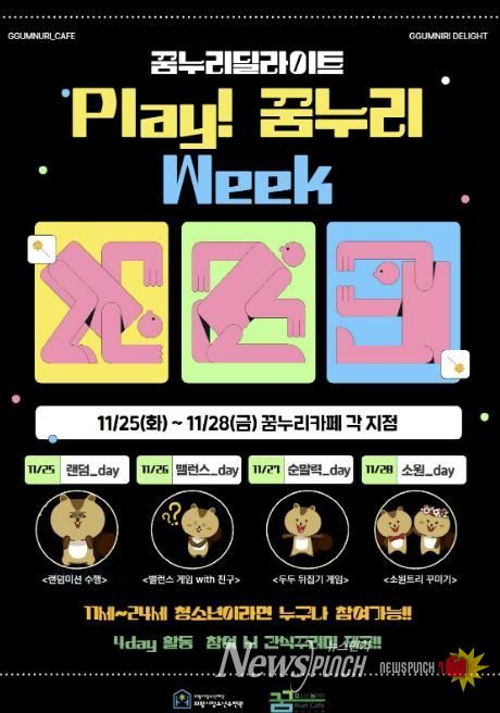 뉴스펀치 김길룡 기자 | 의왕시청소년재단 산하 의왕시청소년수련관 꿈누리카페(▲고천점( 문화공원로 33), ▲내손점(복지로 109), ▲오전점(찬우물길 11), ▲백운밸리점(백운중앙로 74, 총 4개 지점))는 오는 11월 25일부터 28일까지 4일간 꿈누리딜라이트 『Play! 꿈누리 Week』를 진행한다고 밝혔다.