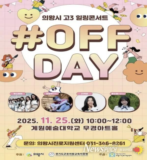 뉴스펀치 김길룡 기자 | 의왕시청소년재단 산하 의왕시진로지원센터가 11월 25일 계원예술대학교 우경아트홀에서 수능을 마친 고3 청소년들을 위한 힐링 콘서트 '#OFF DAY'를 개최한다.