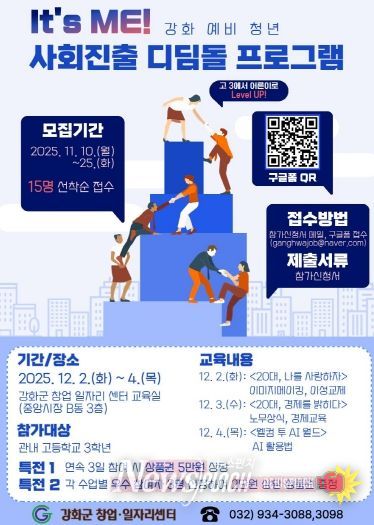프로그램은 강화군 창업·일자리센터 교육실에서 진행되며, 오는 12월 2일부터 4일까지 3일간 다양한 강의와 실습으로 채워질 예정이다.