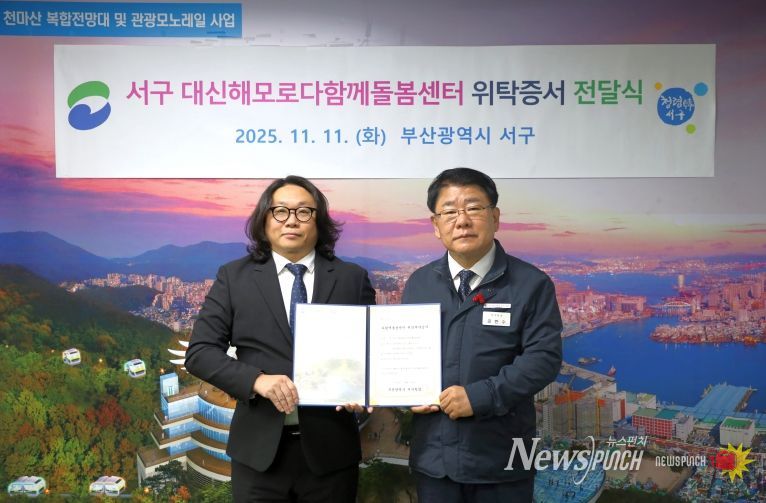 뉴스펀치 김길룡 기자 | 부산 서구는 11월 11일, 지역 중심의 돌봄체계 구축과 초등돌봄 사각지대 해소를 위해 '서구 대신해모로다함께돌봄센터'를 신규 설치하고, 효율적인 운영을 위해 사회복지법인 묘명심(대표 배현철)과 위탁계약을 체결한 뒤 위탁증서를 전달했다.