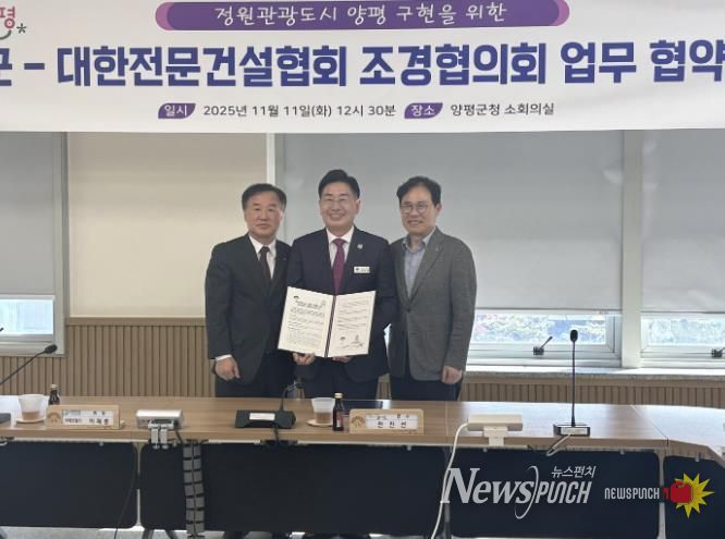 뉴스펀치 김길룡 기자 | 양평군은 지난 11일 군청 회의실에서 대한전문건설협회 조경식재·시설물공사업협의회와 ‘정원관광도시 양평 구현을 위한 조경분야 상생협력 협약식’을 개최했다.