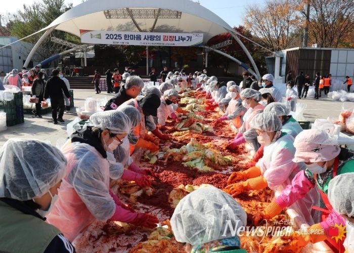뉴스펀치 김길룡 기자 | (사)경기도여성단체협의회 김포시지회가 지난 11일 사우문화체육광장에서 ‘한마음 사랑의 김장나누기’ 행사를 성황리에 개최했다. 행사에 격려하기 위해 참석한 김병수 김포시장은 직접 배추를 버무리며 이웃사랑 실천에 동참하고, 이웃돕기를 위해 헌신하는 여성단체 회원들과 자원봉사자들에게 감사의 뜻을 전했다.