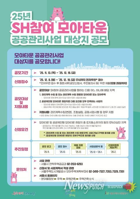 서울시는 올해 ‘SH참여 모아타운 공공관리사업’ 대상지 공모를 11월 13일 공고하고, 12월 8일부터 19일까지 신청받는다고 밝혔다. 공모 대상지를 2024년 10곳에서 2025년 15곳 내외로 50% 확대해 선정하고, 대상지 폭을 넓혀 신규로 모아타운을 희망하는 구역, 주민 스스로 사업추진에 어려움을 겪는 구역 등도 공공이 직접 참여해 사업을 도울 수 있도록 한다.