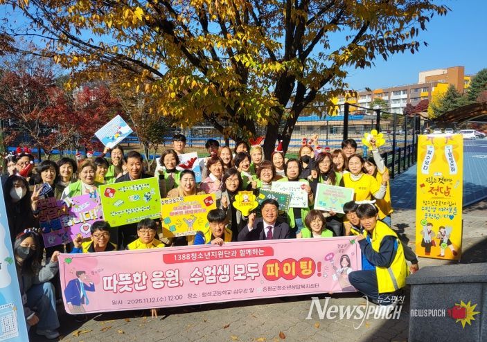 뉴스펀치 김길룡 기자 | 증평군청소년상담복지센터(센터장 윤은미)는 12일 형석고등학교 심우관 앞에서 ‘1388청소년지원단과 함께하는 수능 응원캠페인’을 펼쳤다.