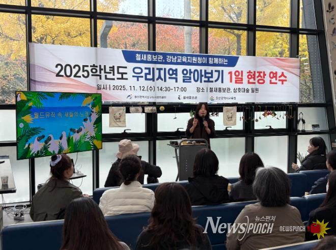 뉴스펀치 김길룡 기자 | 울산 강남교육지원청은 12일 울산 남구 철새홍보관과 삼호대숲 일원에서 초등 교원 40여 명을 대상으로 ‘2학기 우리 지역 알아보기 1일 현장 연수’ 3차 프로그램을 운영했다.