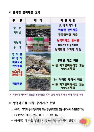 또한 영농폐기물의 올바른 분리배출 안내를 위해 마을 방송, 안내문, 현수막 등을 활용하여 적정 시기에 배출하도록 유도하고, 수거보상금 제도를 적극 홍보할 예정이다.