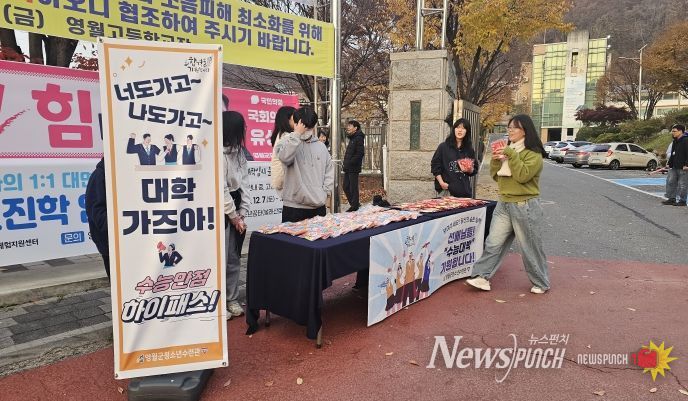 뉴스펀치 김길룡 기자 | 영월군청소년수련관(관장 이두영)은 2026학년도 대학수학능력시험을 맞아 지난 11월 13일(목) 수험생 약 272명을 대상으로 영월고등학교와 석정여자고등학교 앞에서 활력 가득한 수능 응원 캠페인을 진행했다.
