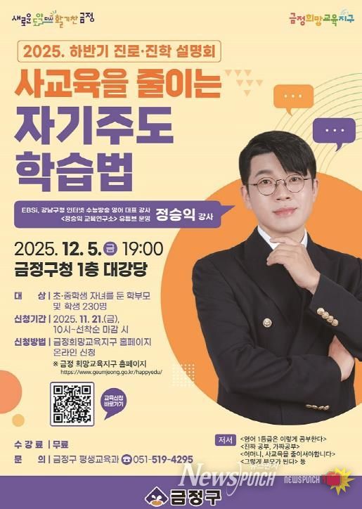 뉴스펀치 김길룡 기자 | 부산시 금정구는 12월 5일 저녁 7시 금정구청 대강당에서 관내 초․중학생과 학부모 230명을 대상으로 녩. 하반기 진로·진학 설명회 정승익 강사 초청 특강’을 진행한다고 밝혔다.