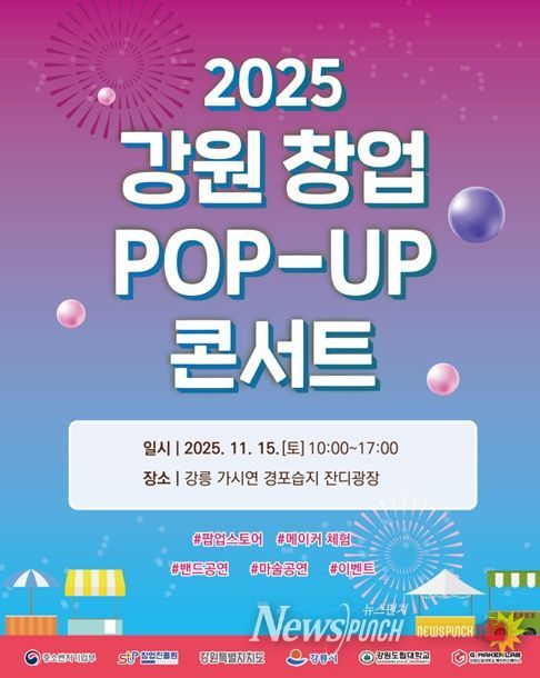 뉴스펀치 김길룡 기자 | 강원도립대학교는 오는 11월 15일, 강릉 경포 가시연 습지 잔디광장에서 도내 창업자와 지역주민이 함께 참여하는 '2025 강원 창업 팝-업(POP-UP) 콘서트'를 개최한다.