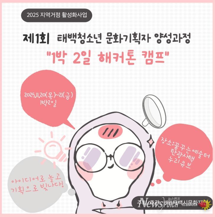 뉴스펀치 김길룡 기자 | (재)태백시문화재단은 11월 20일)부터 21일까지 1박 2일간 태백 꿈꾸는 예술터(탄광사택 누리큐브)에서 '제1회 태백 청소년 문화기획자 양성과정 ‘1박 2일 해커톤 캠프’'를 운영한다.