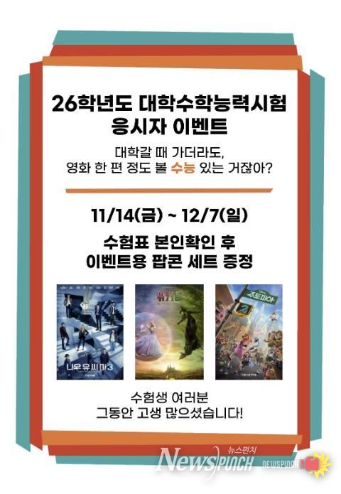 뉴스펀치 김길룡 기자 | 산청군작은영화관은 2026학년도 대학수학능력시험 수험생을 대상으로 ‘수능 응시자 이벤트’를 추진한다고 13일 밝혔다.