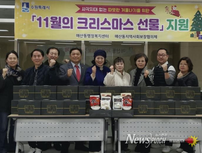 뉴스펀치 김길룡 기자 | 수원시 팔달구 매산동 지역사회보장협의체는 지난 12일, ‘11월의 크리스마스 선물 전달식’을 열고 관내 어려운 이웃들에게 음식 꾸러미 150세트를 전달했다.