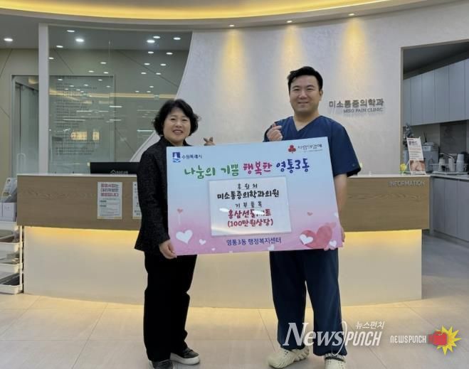 이강여 영통3동장은 “지역사회 발전과 복지증진을 위해 기여해준 미소통증의학과의 뜻깊은 나눔에 감사하다. 기탁된 물품이 필요한 가정에 소중히 전달되어 이웃들에게 따뜻한 온기로 전해지길 바란다”고 말했다.