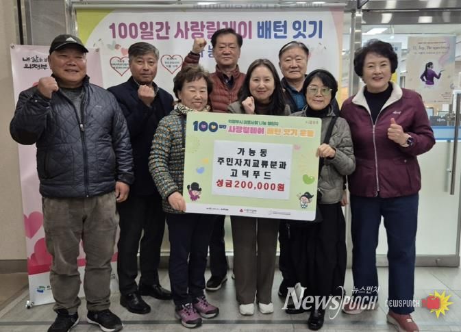 뉴스펀치 김길룡 기자 | 의정부시 가능동주민센터는 11월 11일 주식회사 고덕푸드가 ‘100일간 사랑릴레이 배턴 잇기’에 동참해 성금 20만 원을 기탁했다고 밝혔다.