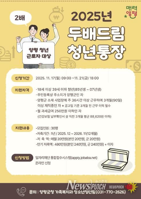 뉴스펀치 김길룡 기자 | 양평군은 청년들의 자립과 미래 설계 기반 마련을 위해 ‘두배드림 청년통장’ 사업을 추진한다고 밝혔다.