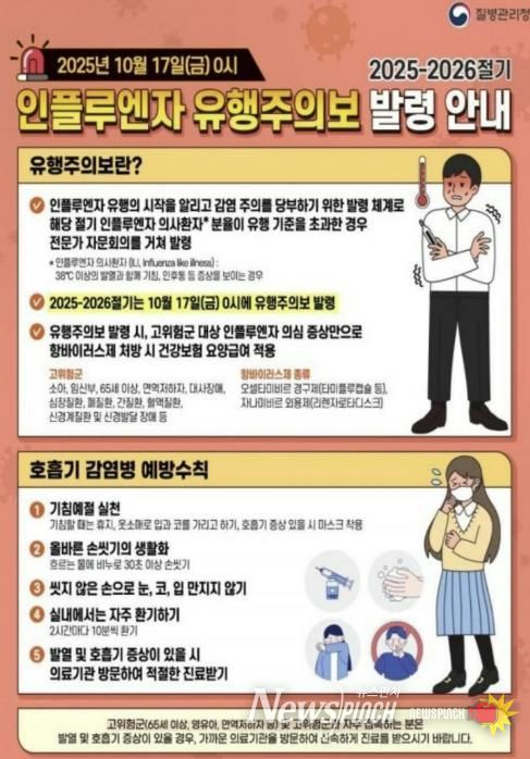 인플루엔자 예방을 위해서는 ▲예방접종 실시 ▲흐르는 물에 30초 이상 손 씻기 ▲기침·재채기 시 옷소매로 가리기 ▲발열 시 외출 자제 등의 수칙을 지키는 것이 중요하다. 특히 고위험군(만 13세 이하 어린이, 임신부, 65세 이상 어르신, 만성질환자)은 반드시 예방접종을 받아야 하며, 증상이 나타날 경우 자가진단 대신 가까운 의료기관에서 정확한 진료를 받아야 한다.