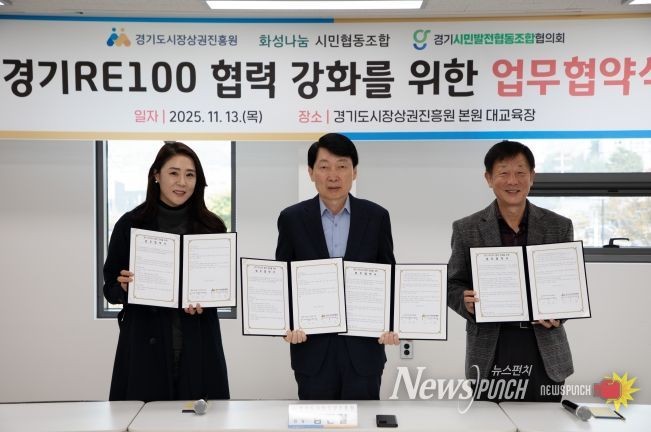 뉴스펀치 김길룡 기자 | 경기도시장상권진흥원은 ‘경기 RE100’ 실현을 위해 화성나눔시민협동조합, 경기시민발전협동조합협의회와 13일 업무 협약을 체결했다고 밝혔다.