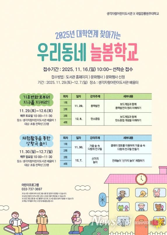 뉴스펀치 김길룡 기자 | 원주시 생각자람어린이도서관은 초등학생 전 학년을 대상으로 ‘대학연계 찾아가는 우리동네 늘봄학교 프로그램’을 운영한다.