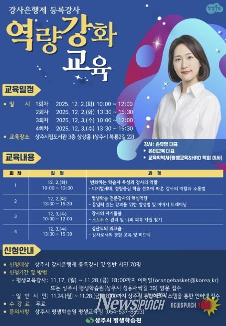 뉴스펀치 김길룡 기자 | 상주시는 11월 17일부터 11월 28일까지‘2025년 강사은행제 등록강사 역량강화 교육’수강생 70명을 모집한다.