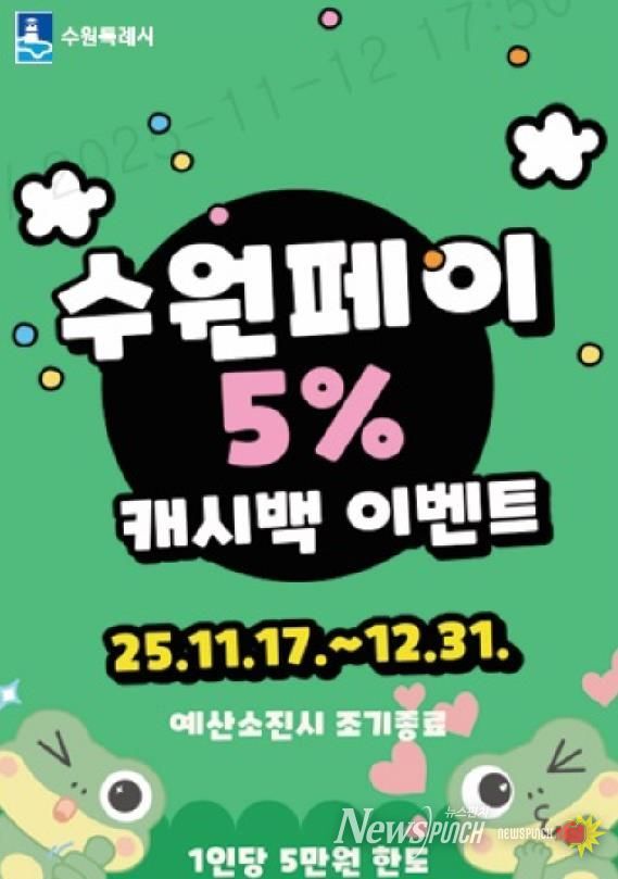 수원특례시는 17일부터 12월 31일까지 ‘수원페이 5% 캐시백 이벤트’를 연다. 수원페이 충전금으로 결제하면 5% 캐시백을 지급한다.